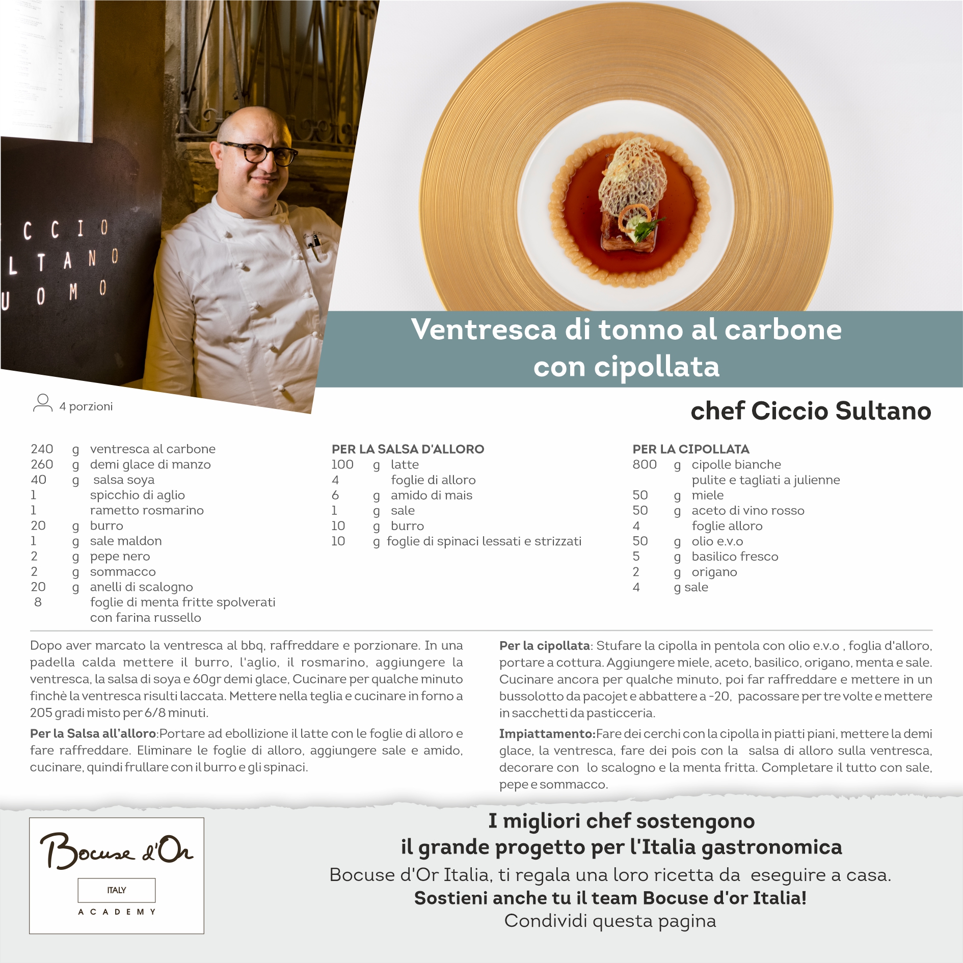 I migliori Chef sostengono il grande progetto dell’Italia gastronomica, oggi per voi la ricetta dello Chef Ciccio Sultano. Bocuse d’Or Italia ti regala una loro ricetta da eseguire a casa. Sostieni anche tu il team!!!