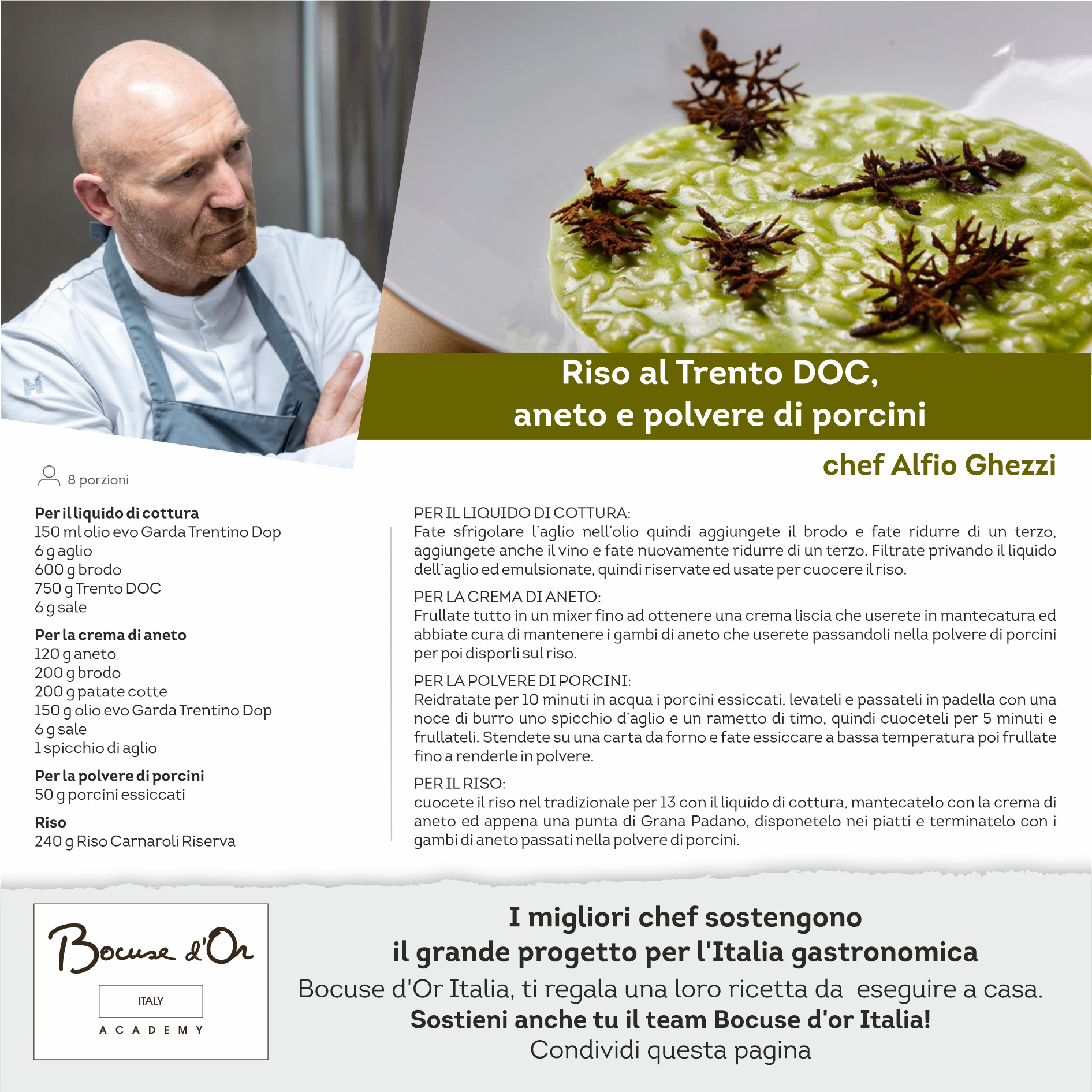 I migliori Chef sostengono il grande progetto dell’Italia gastronomica, oggi per voi la ricetta dello Chef Alfio Ghezzi. Bocuse d’Or Italia ti regala una loro ricetta da eseguire a casa. Sostieni anche tu il team!!!
