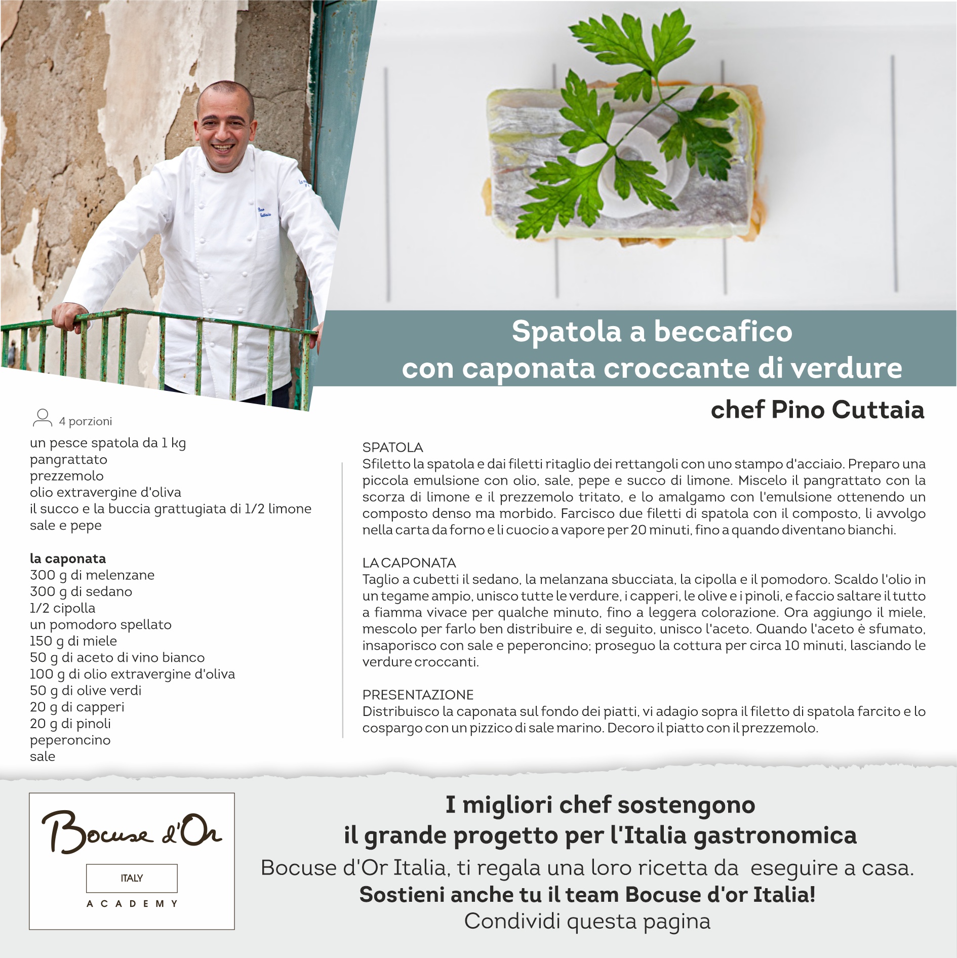 I migliori Chef sostengono il grande progetto dell’Italia gastronomica, oggi per voi la ricetta dello Chef Pino Cuttaia. Bocuse d’Or Italia ti regala una loro ricetta da eseguire a casa. Sostieni anche tu il team!!!