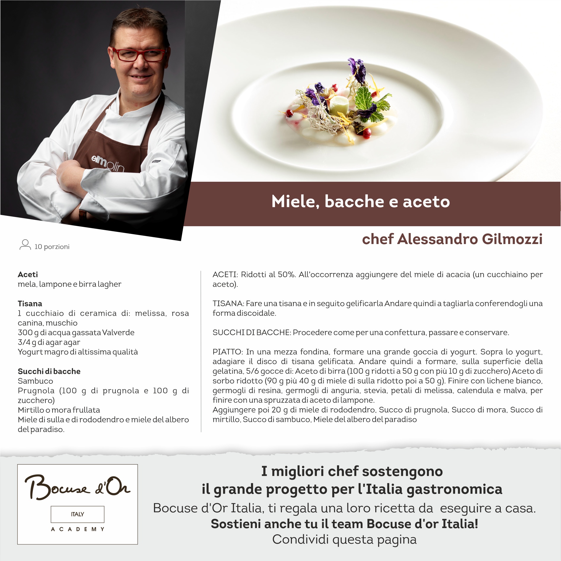 I migliori Chef sostengono il grande progetto dell’Italia gastronomica, oggi per voi la ricetta dello Chef Alessandro Gilmozzi. Bocuse d’Or Italia ti regala una loro ricetta da eseguire a casa. Sostieni anche tu il team!!!