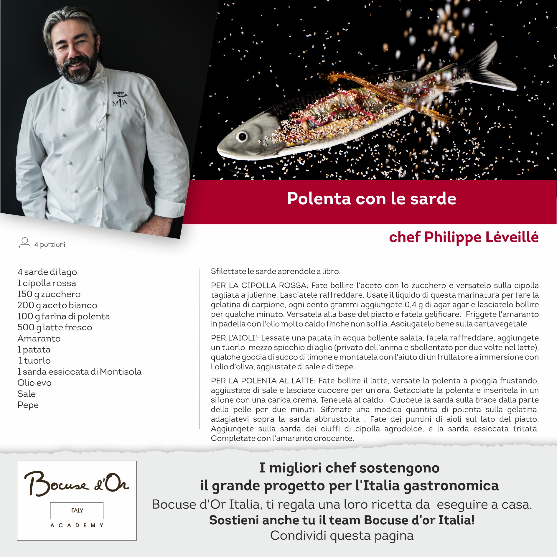 I migliori Chef sostengono il grande progetto dell’Italia gastronomica, oggi per voi la ricetta dello Chef Philippe Léveillé. Bocuse d’Or Italia ti regala una loro ricetta da eseguire a casa. Sostieni anche tu il team!!!
