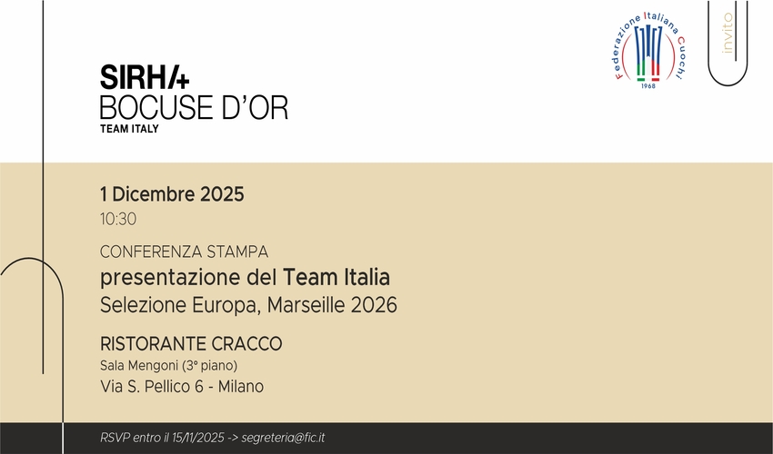Si terrà il 1° dicembre 2025, dalle 10.30 alle 14.00, la conferenza stampa ufficiale di presentazione del Team Italia che rappresenterà il nostro Paese alla finale europea del Bocuse d’Or 2026, uno dei più prestigiosi e riconosciuti concorsi internazionali di alta cucina.